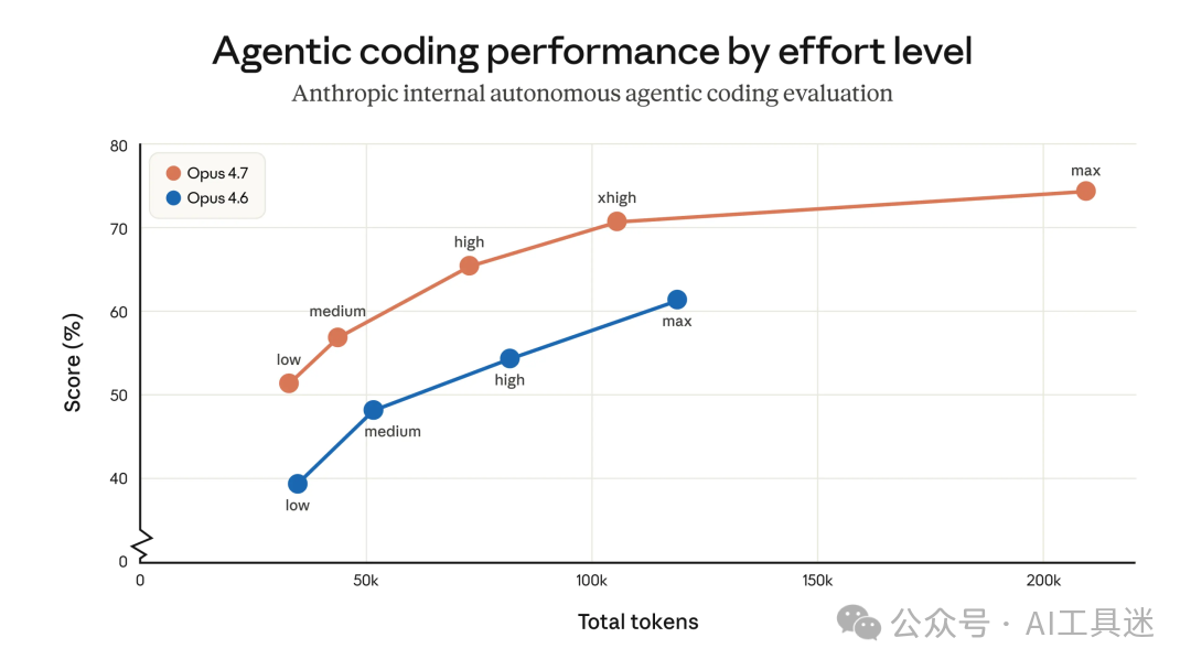 用户可以通过多种方式控制 token 的使用:例如使用工作量参数、调整任务预算或引导模型简化代码。在 Anthropic 自己的测试中,最终效果是积极的 —— 内部编码评估显示,所有工作量级别的令牌使用率均有所提高(如下所示)—— 但 Anthropic 建议在实际流量上进行评估。