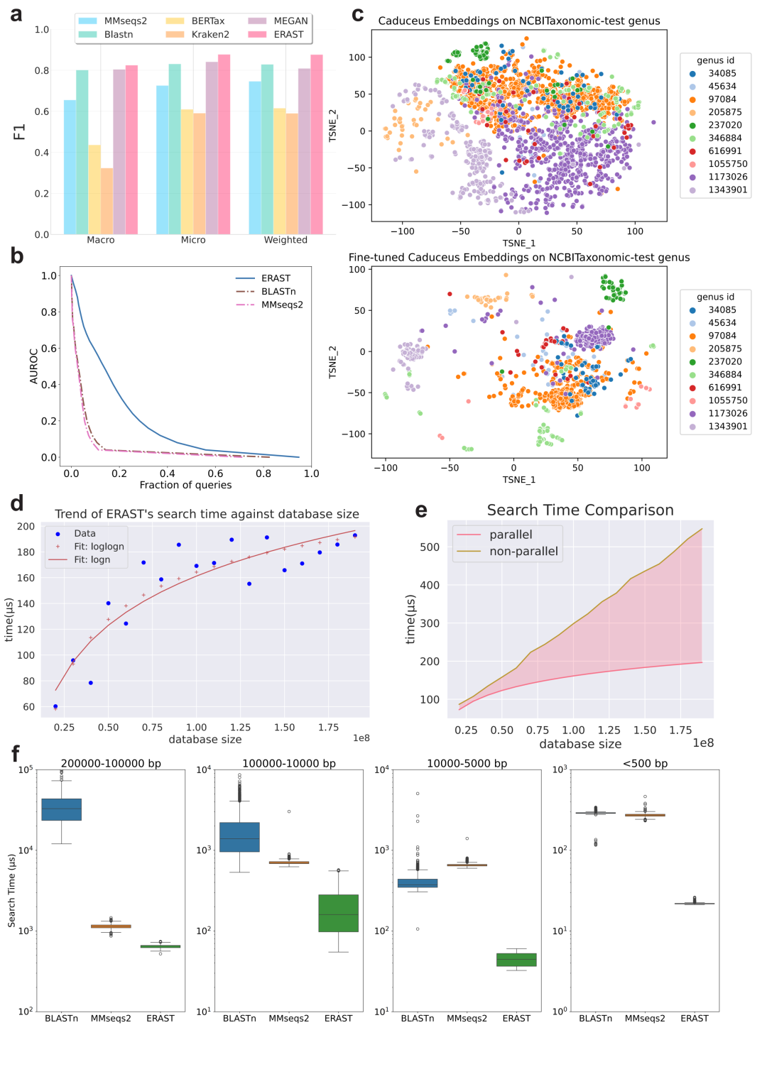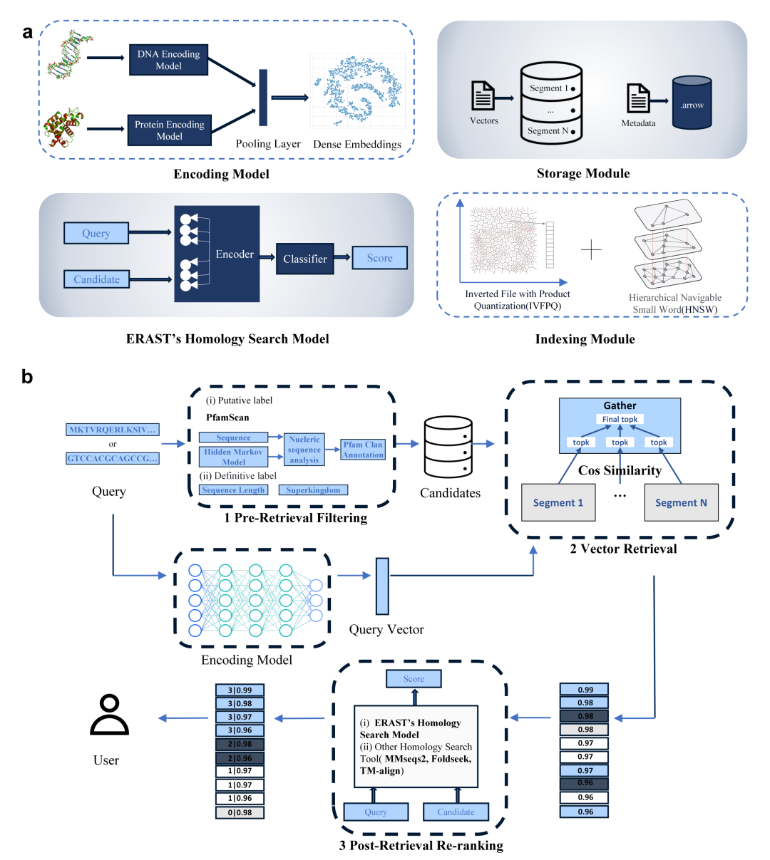 ERAST通过集成ESM2预训练蛋白质语言模型(Protein-LLM)与Caduceus长序列预训练核苷酸语言模型(Nucleotide-LLM),将海量生物序列编码为高维向量,从而构建了当前规模最大、涵盖超过10亿条的生物序列向量数据库。ERAST利用预训练生物语言大模型所习得的进化、结构与功能特征,增强序列向量表示质量,提升检索后重排序效率,拓展分布外序列的检索泛化能力,为大规模生物分子同源性搜索提供了全新的高效解决方案。