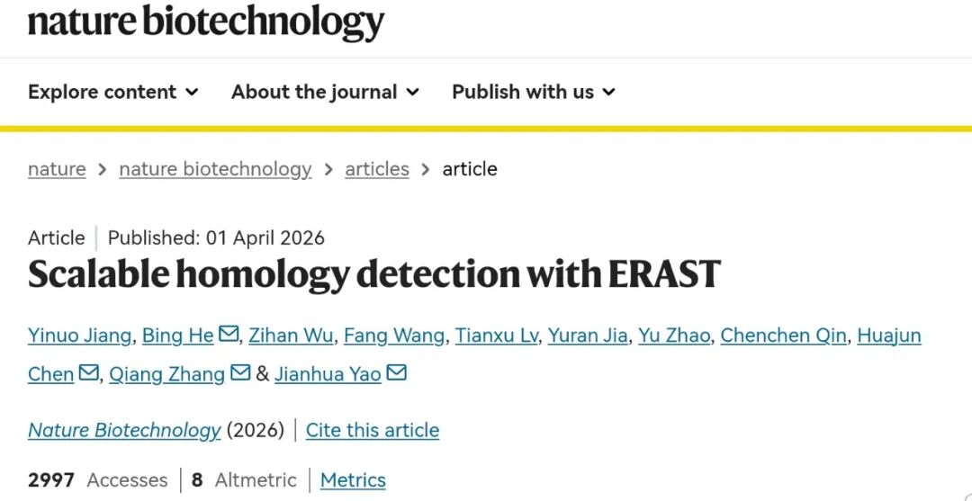 同源性检索是现代分子生物学识别序列祖先与功能的基石,经历了从BLAST等传统启发式搜索到Foldseek等结构比对方法的演进。然而,该领域仍面临两大核心挑战:一是生物序列数据量极其庞大,其中宏基因组数据库规模高达十亿级;二是高精度检索(尤其是蛋白结构比对和长核苷酸检索)计算成本高昂且速度缓慢。针对这些瓶颈,研究者提出了基于生物语言大模型的检索增强型比对搜索工具——ERAST,相关工作发表在Nature旗舰期刊《自然·生物技术》(5-year IF: 59.5)。