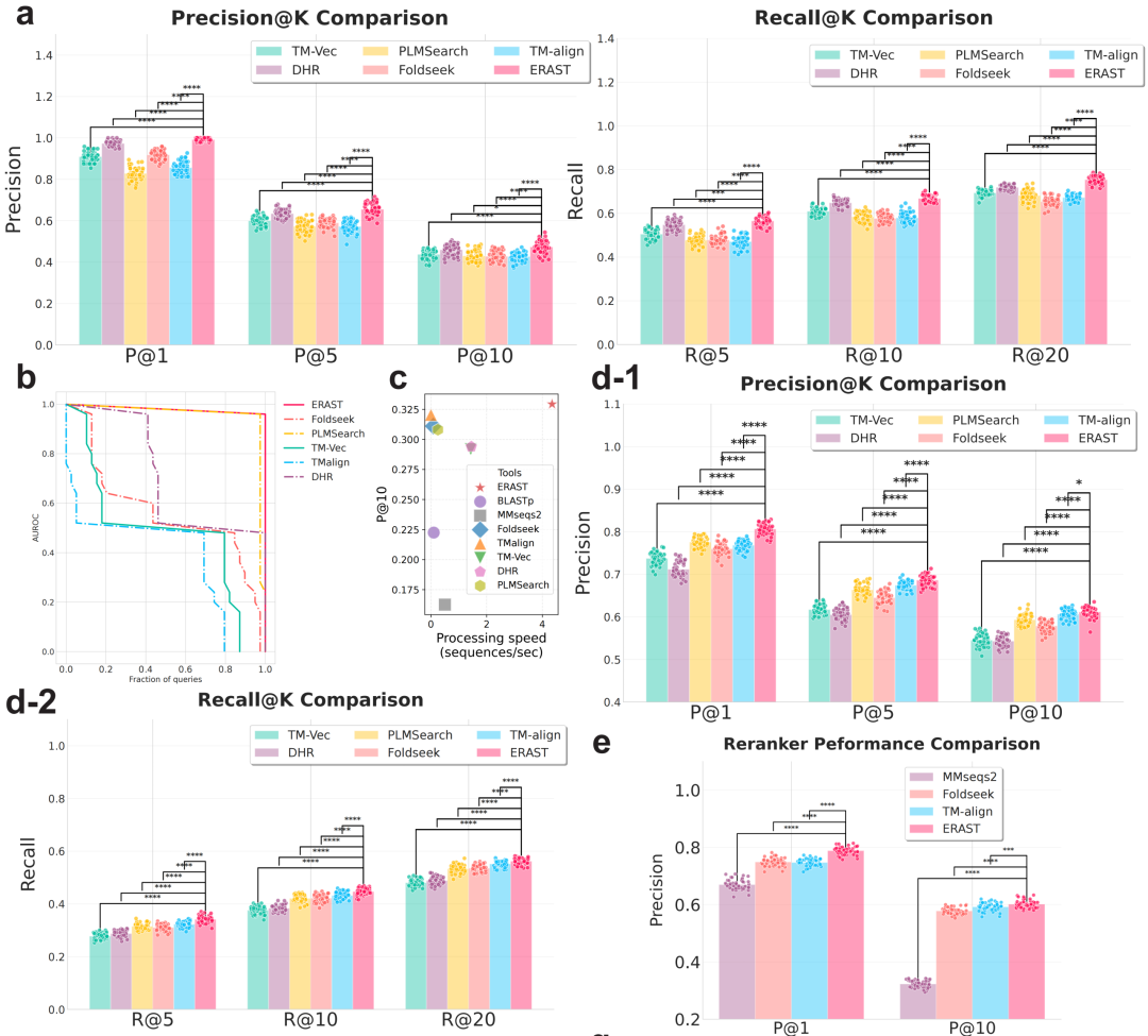 (3)检索后重排序: 针对远源同源序列的精准检索仍是挑战。以往研究侧重于改进编码模型,但每次模型更新都要重新编码千万级序列,成本极高。ERAST 引入了检索后重排序机制,通过设计的评分模型 (EHSM) 评估查询序列与目标的匹配度并重新排序。与侧重表征的编码模型不同,该评分模型的目标是学习如何进行排序。我们将查询序列与每个候选序列拼接后输入 EHSM,并将同源性评分建模为一个多标签分类任务。具体而言,模型根据候选蛋白质与查询蛋白质的关系亲疏进行评分,将其分为四个等级:(1) 同族;(2) 非同族但同超家族;(3) 非同超家族但同折叠类型;(4) 非同折叠类型。该重排序模块具有可插拔性,支持灵活集成 EHSM、MMseqs2 或 TM-Align 等多种策略,在不频繁更新向量库的前提下提升检索精度。