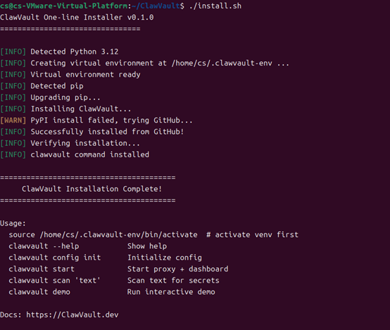 3、配置拦截域名:编辑~/.ClawVault/config.yaml,添加需防护的AI模型/代理商域名 4、启动项目:./scripts/start.sh并访问Web控制台:http://127.0.0.1:8766
