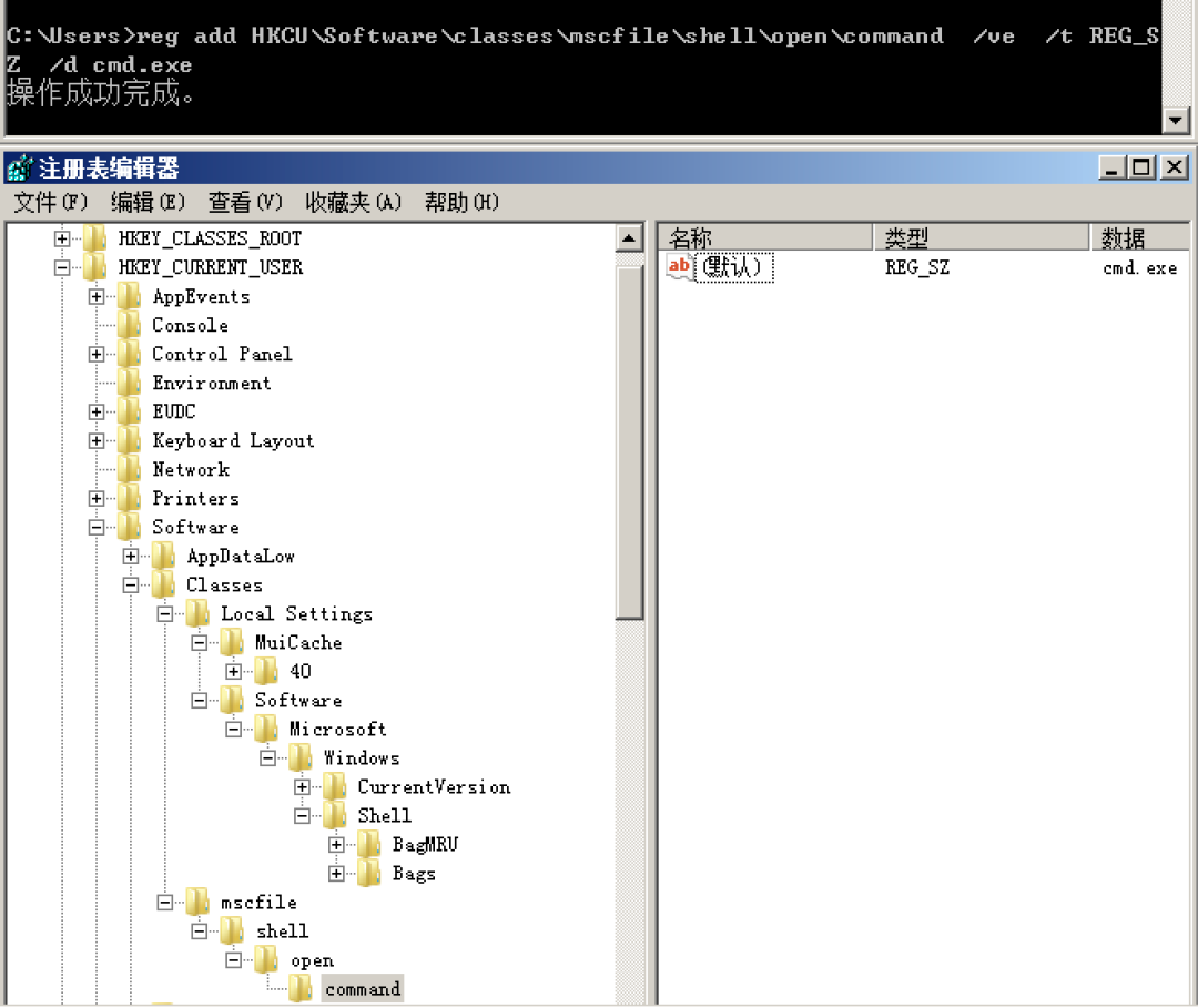 值得注意的是,HKCU\Software\Classes\mscfile\shell\open\command注册表项默认不存在,且普通用户可以修改,所以可以使用如下命令,添加一个不存在的键值cmd.exe,劫持原来的启动流程,即可启动高权限的cmd进程,添加成功后效果如图所示。