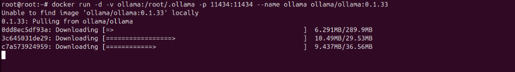 docker run -d -v ollama:/root/.ollama -p 11434:11434 --name ollama ollama/ollama:0.1.33