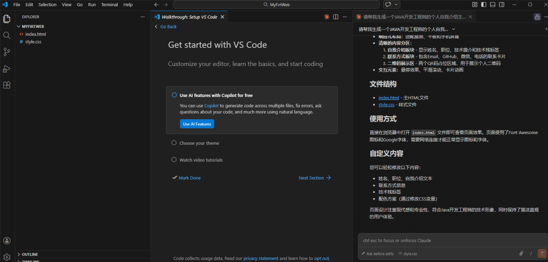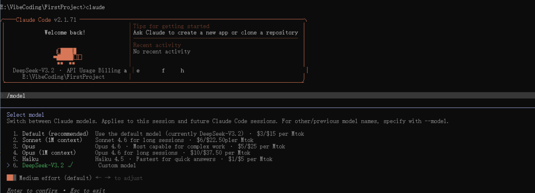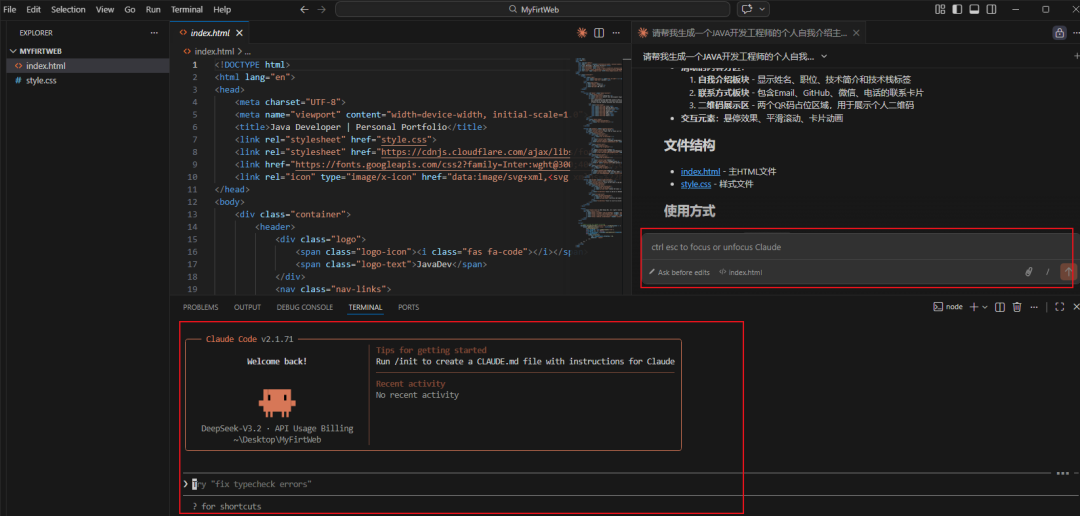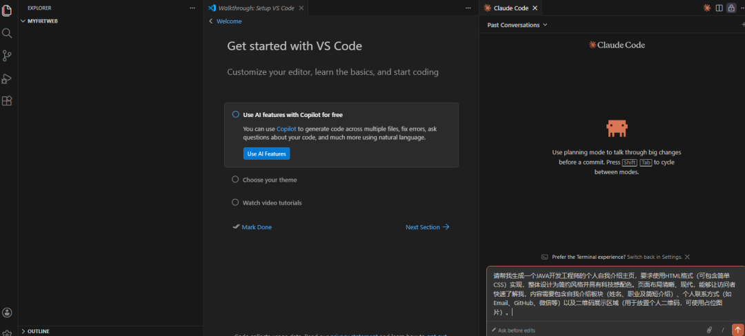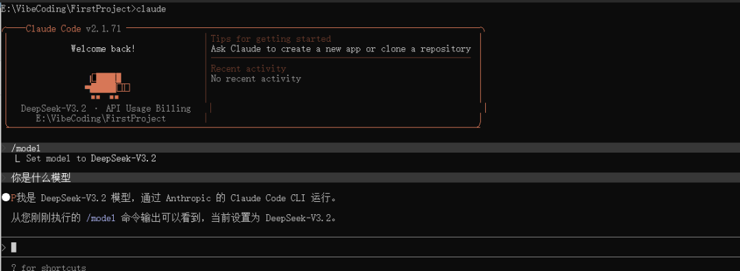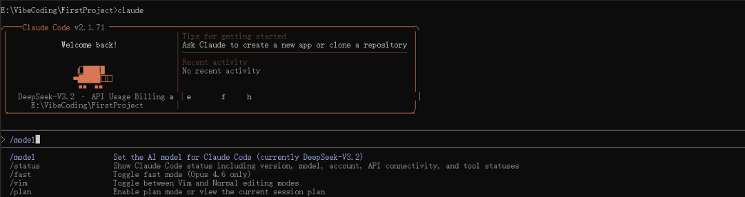 随后再次使用claude打开即可,此时我们可以通过命令行模式+ 图形化模式进行Claude Code的使用: