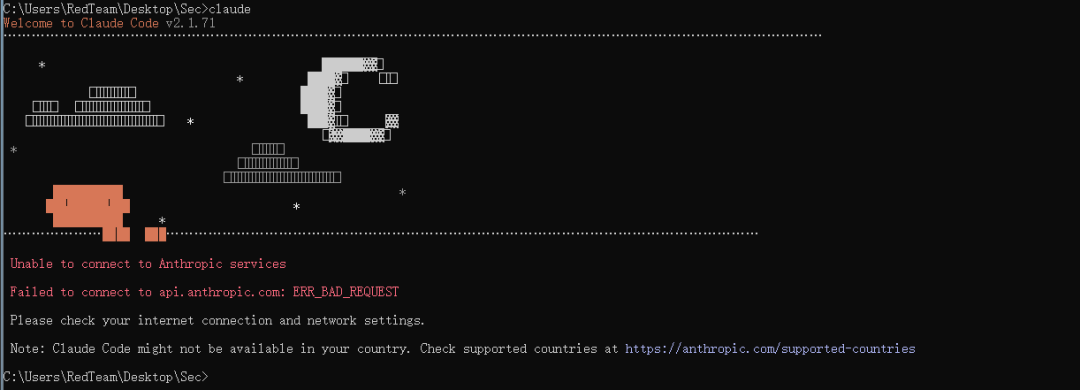 随后我们再次执行"claude"命令即可进入到Claude Code,但是我们又遇到了下面的一个新的问题,这主要是由于Claude对国内使用有限制,在这里我们需要修改一下配置文件