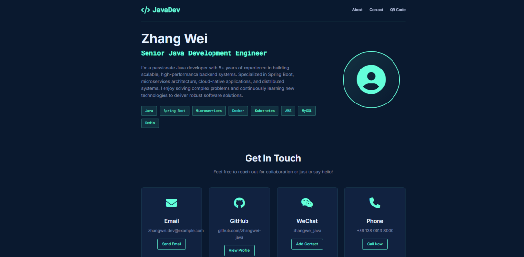 请帮我生成一个JAVA开发工程师的个人自我介绍主页,要求使用HTML格式(可包含简单 CSS)实现,整体设计为简约风格并具有科技感配色。页面布局清晰、现代,能够让访问者快速了解我,内容需要包含自我介绍板块(姓名、职业及简短介绍)、个人联系方式(如 Email、GitHub、微信等)以及二维码展示区域(用于放置个人二维码,可使用占位图片)。