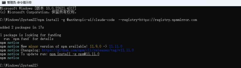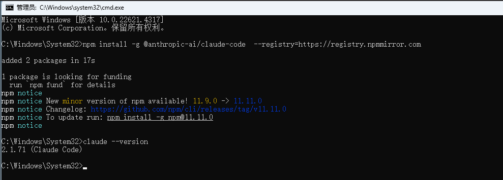 npm install -g @anthropic-ai/claude-code --registry=https://registry.npmmirror.com