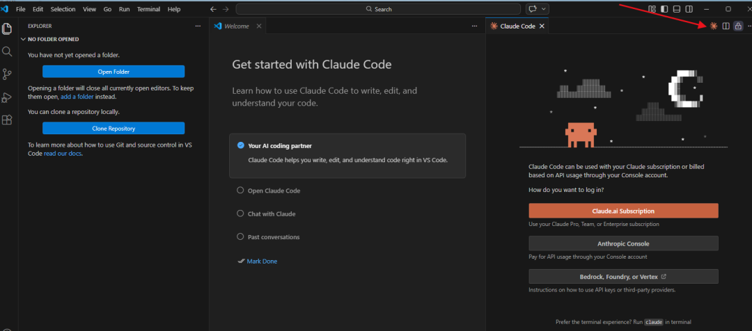 Step 4:随后我们在VS Code中点击"Claude Code"的图标,此时可以看到这里有登录选项,由于我们本地已经通过CC-Switch进行了配置模型供应商,所以等一会儿过后就会直接跳过登录