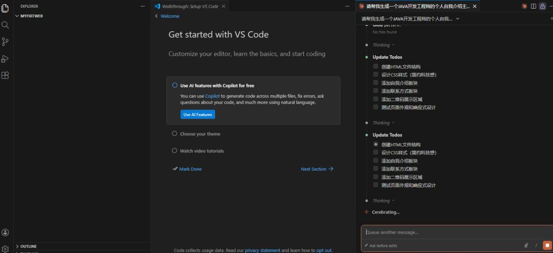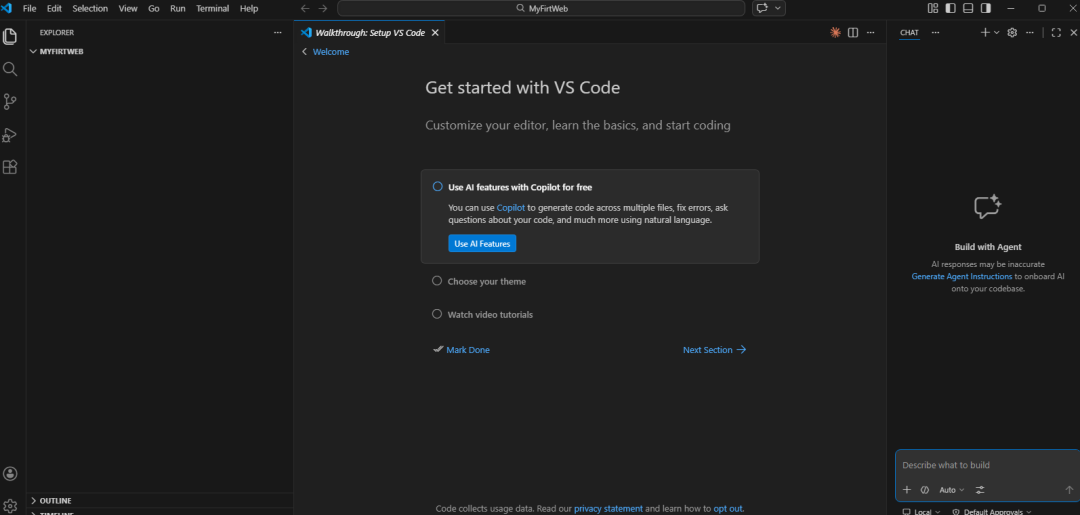 随后我们在桌面上创建一个文件夹MyFirtWeb并使用VS Code打开
