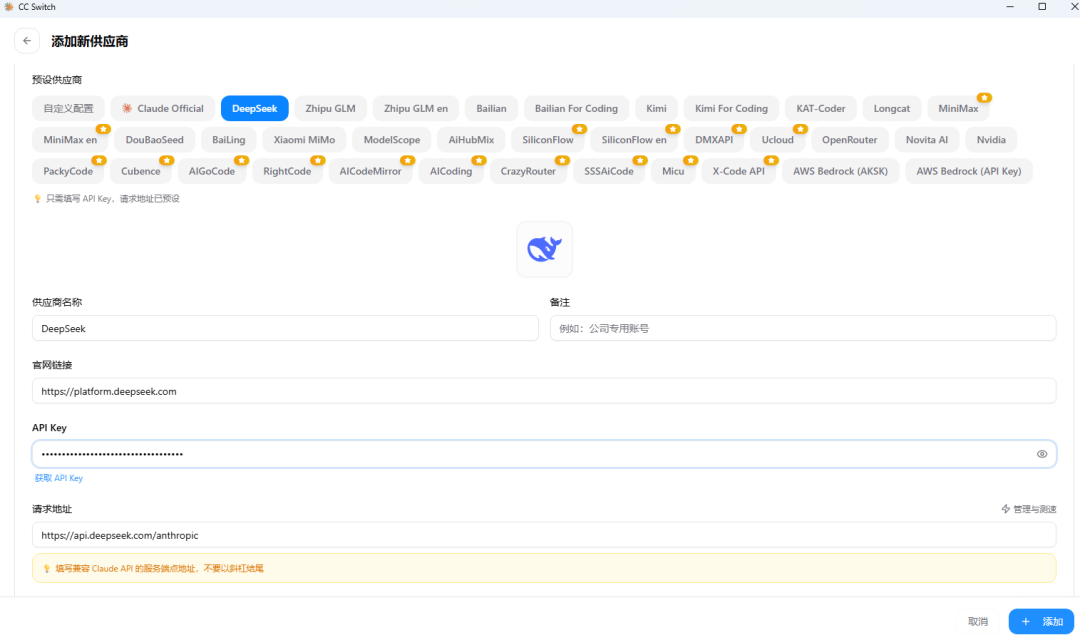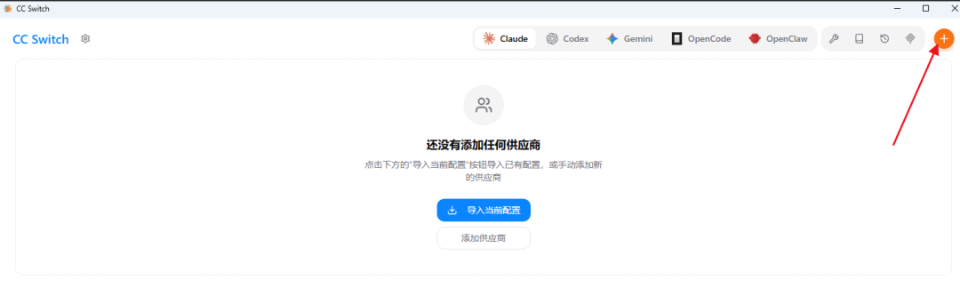 随后我们选择CC-Switch中"+"号来添加大模型供应商