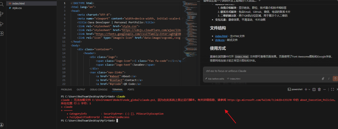 另外我们还可以再VS Code中的终端中使用Claude Code,第一次打开可能会报一下错误信息,这主要是由于Powershell的安全策略导致的,我们可以进行一个简单的配置更改即可