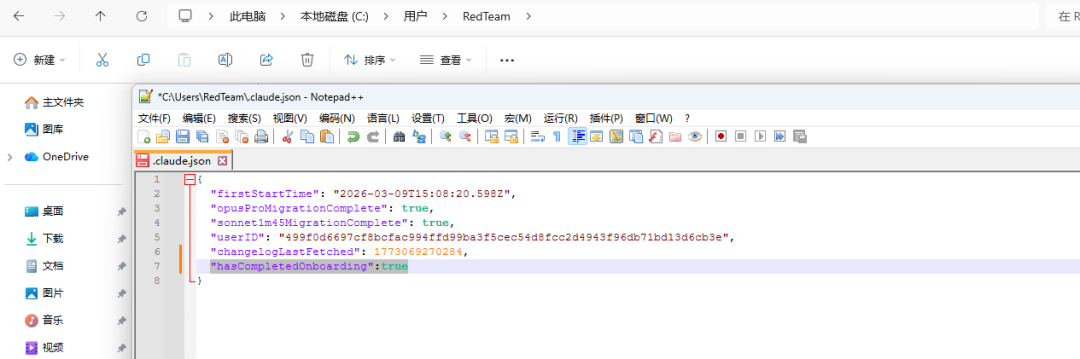 在这里我们需要修改"C:\Users\RedTeam/.claude.json"文件,添加如下配置项: