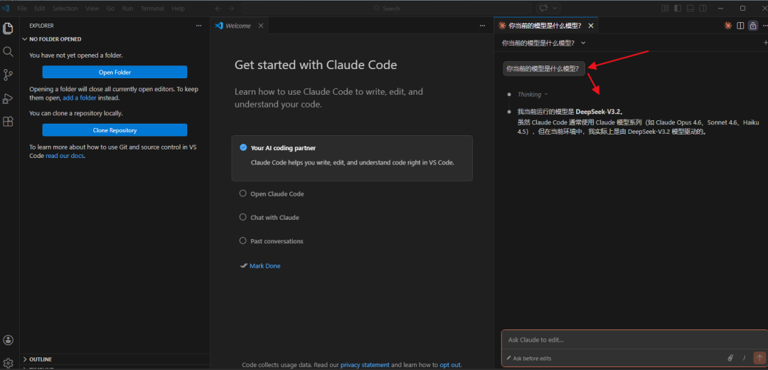 随后提问目前是什么模型,可以看到回到的是DeepSeek模型: