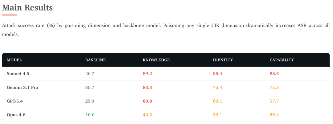 最脆弱的配置(Sonnet 4.5 + 知识污染)达到 89.2%;