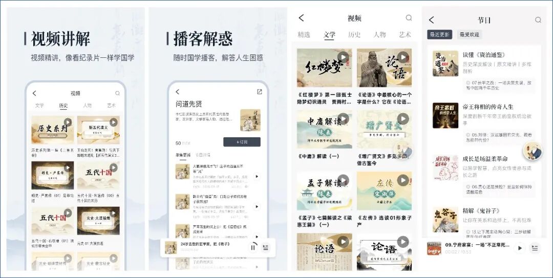 除了以上,也支持视频讲解,播客解说,视频讲解都是大师级别的人讲解的,也是按分类查看的方式,也可以直接搜索找到想要讲解的。