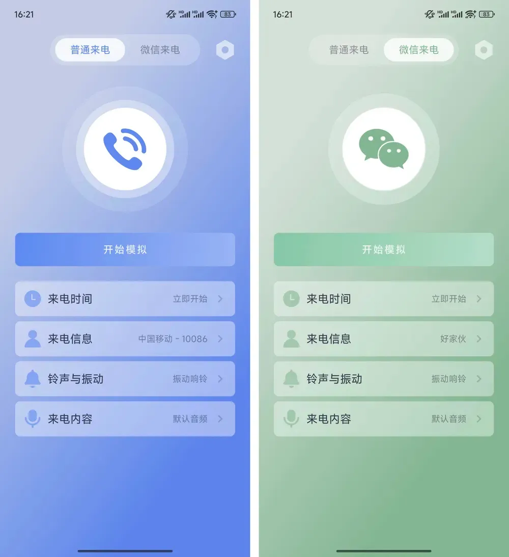 我们常见的来电功能也就两种,微信和电话,像QQ之类的说话确实用的也不多,所以这个APP也就只提供这2种功能。