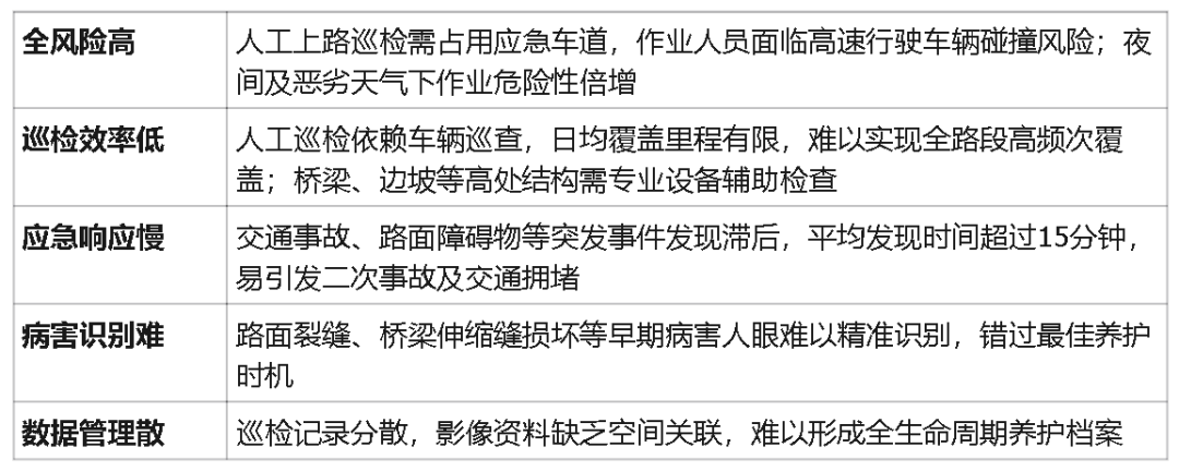 高速公路作为国家交通大动脉,具有车流量大、车速快、封闭性强等特点,传统人工巡检模式面临严峻挑战: