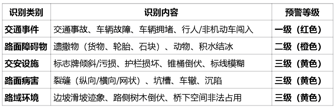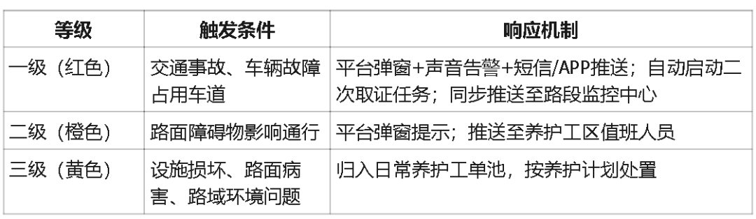 - 动态要素:实时显示无人机位置、飞行轨迹;预警事件按等级着色标识(红色-交通事故、橙色-路面障碍物、黄色-设施损坏/病害)