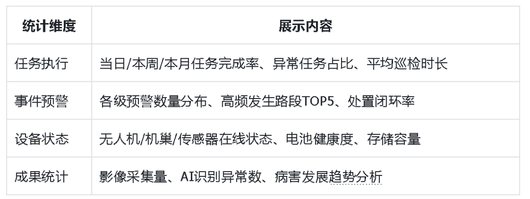 - 巡检报告:自动生成日报/周报/月报,含巡检里程、事件统计、病害趋势分析