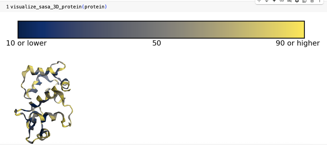 我们还可以将这些SASA值映射到结构的3D可视化上,利用我们拥有这种蛋白质的3D坐标这一事实。