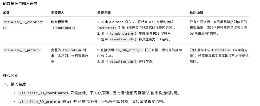 visualize_3D_protein函数是从ESMProtein实例中可视化,该实例具有正确的氨基酸