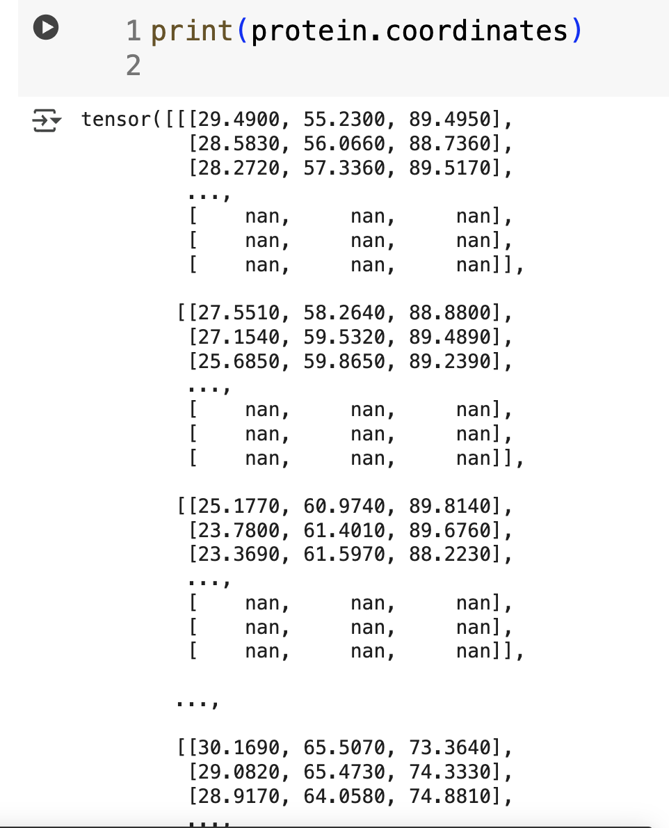 37: 37是氨基酸中原子的最大可能数量,以atom37表示。如果结构中不存在某些原子,它们将显示为nan。因为蛋白质由氨基酸组成,而每一种氨基酸又由不同的原子组成,所以这里是原子坐标,如果没有这个原子,那么其坐标则为nan