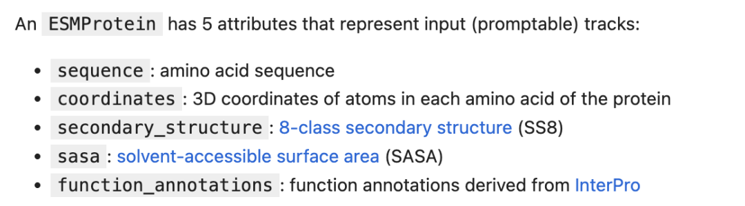 在本节内容中,我们将熟悉ESMProtein类,该类包含代表序列、结构和功能的蛋白质的多种属性。ESM3模型使用输入(提示)中的这些属性,并将其作为输出的一部分生成。