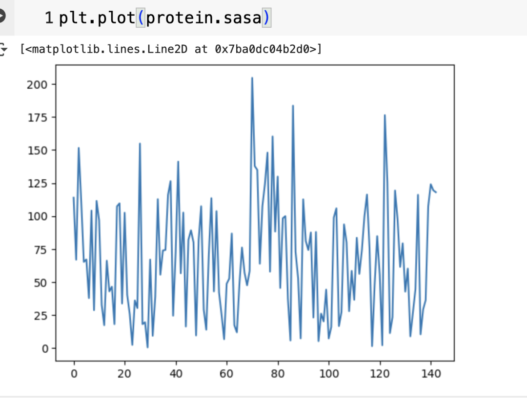 ESMProtein 的最后一条输入通道是“溶剂可及表面积”(SASA)。它为每个氨基酸标示出暴露于溶剂的面积大小。我们可以调用 ProteinChain 的 sasa 函数来计算该指标,该函数内部实际依赖 biotite 库的 sasa 实现。