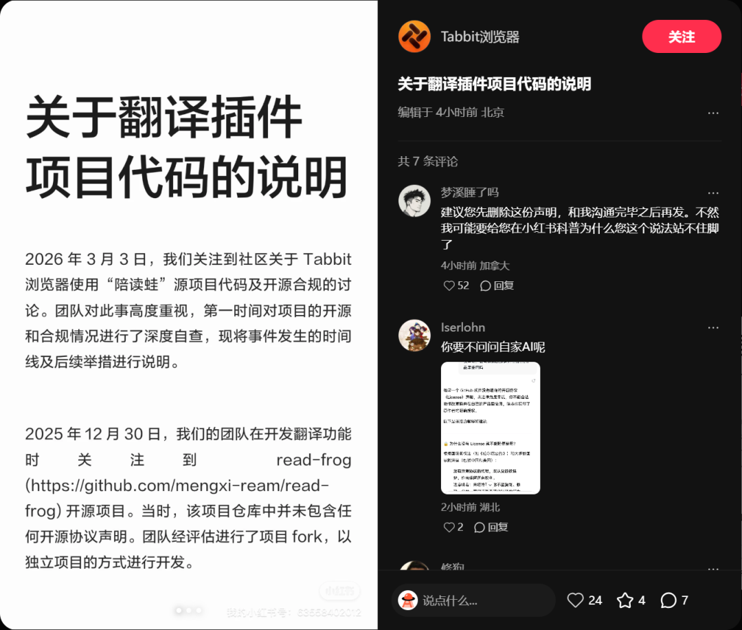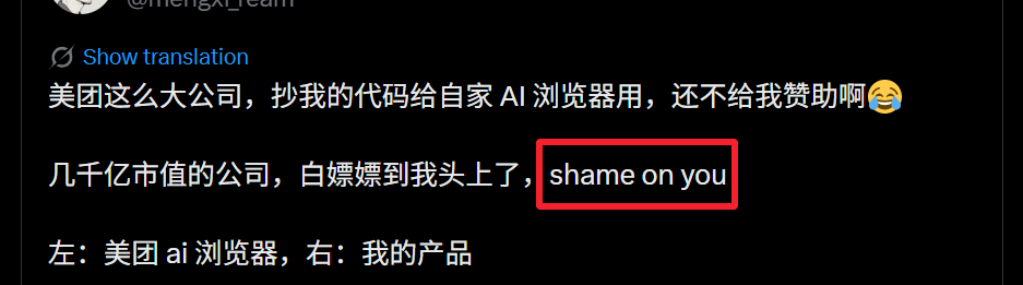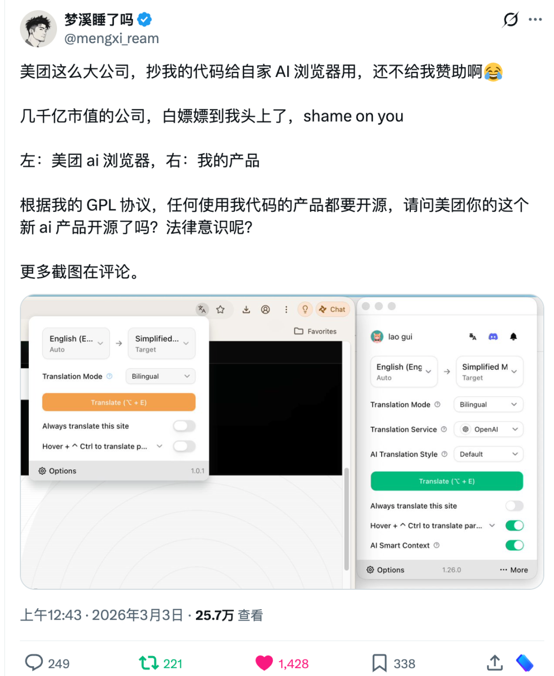 科技圈的瓜永远不缺席!前几天还在高调官宣杀入AI赛道的美团,转头就因为一款浏览器陷入抄袭争议,剧情反转比电视剧还刺激。一边是市值几千亿的互联网大厂,一边是靠爱发电的独立开发者,这场“抄作业被抓包”的大戏,不仅暴露了开源协议的坑,更戳中了行业创新的痛点~