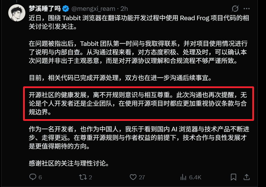 开源社区的魅力在于“互相成就”,开发者无偿分享技术,换的是尊重和共同进步,而不是被大厂当成免费素材库。美团及时整改的态度值得肯定,但更重要的是,所有企业都该记住:AI时代拼的不只是技术和速度,还有对规则的敬畏、对原创的尊重。