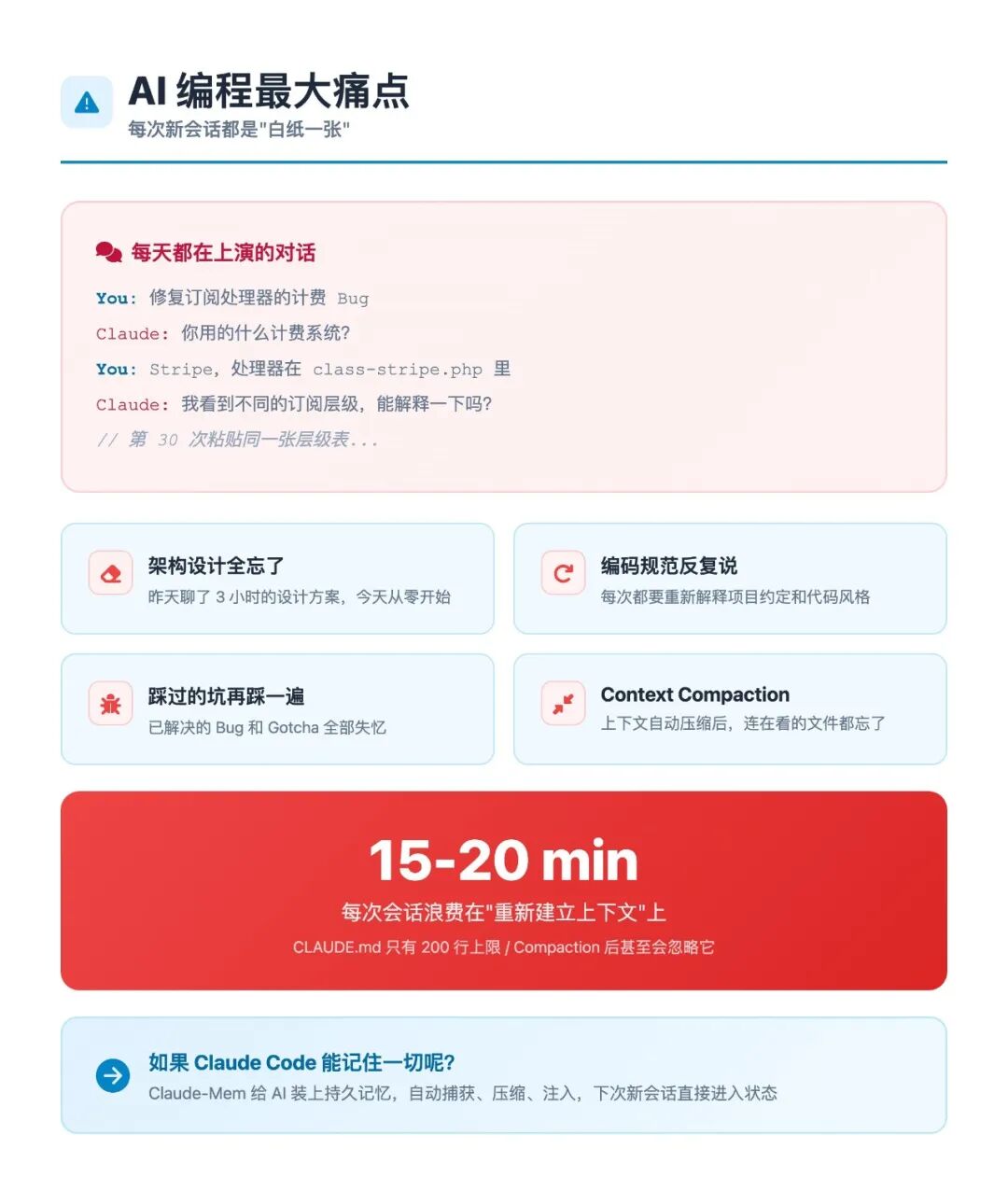 对比维度 | 传统使用Claude Code | 使用claude-mem增强后 |