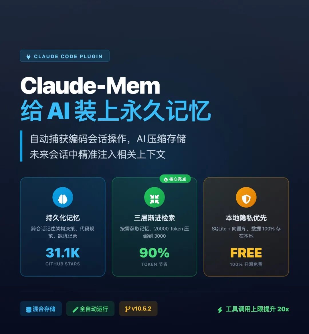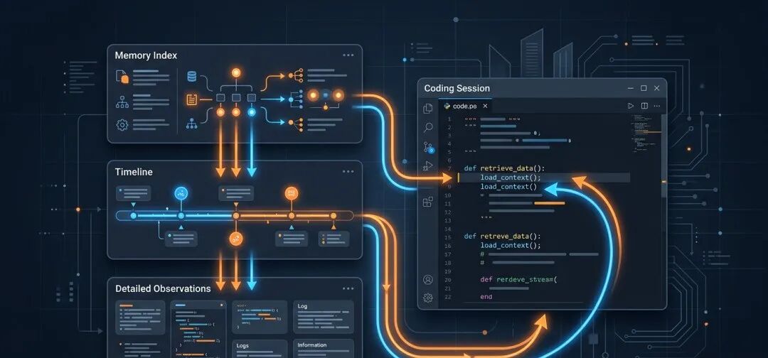 claude-mem不是传统的“聊天记录保存工具”,而是围绕AI编程工作流搭建的记忆基础设施,核心解决Claude Code原生缺乏长期上下文的痛点。它不会把整段旧对话塞回新会话,而是将历史操作、关键信息、阶段总结提炼成可检索的记忆索引,新会话中按需调取细节,从根源上减少Token的无效消耗。
