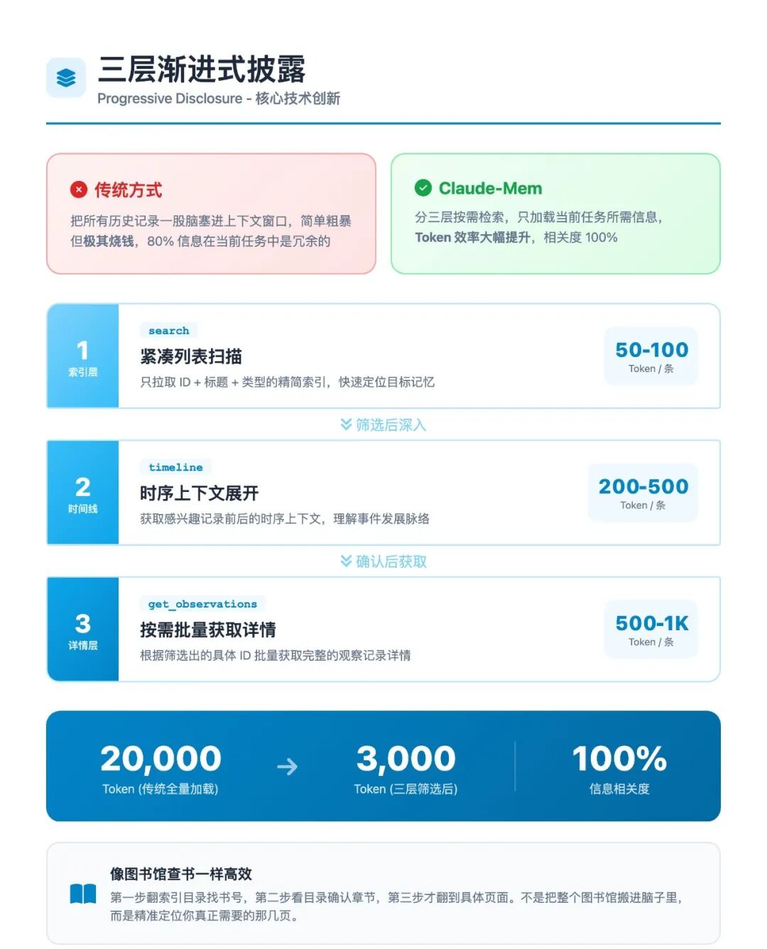 上下文处理 | 整段粘贴旧对话,重复消耗Token | 提取记忆索引,按需调取细节,Token消耗大幅降低 |