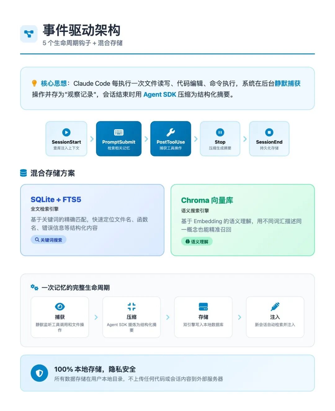 在Claude Code中进行写代码、查Bug、重构项目等操作时,claude-mem的hooks层会自动捕捉关键动作,将工具调用、指令提交、阶段结果等信息记录下来,实时生成observation和summary,无需手动触发记录功能。