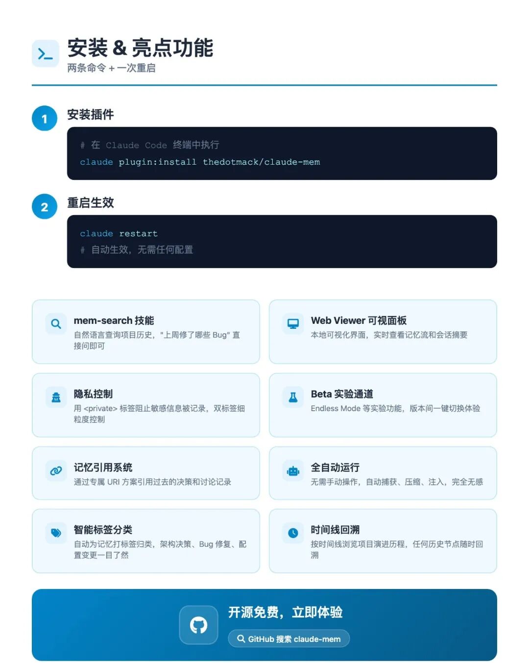 git clone https://github.com/thedotmack/claude-mem.gitcd claude-mem && npm installnpm run buildnpm linkclaudemem --help 查看命令并启动对应服务npm install -g claude-mem)仅能获取SDK,无法自动配置hooks和worker服务,新手不建议使用claude-mem安装后会自动运行,无需繁琐的日常配置,核心使用流程分为三步,贴合日常AI编程的操作习惯: