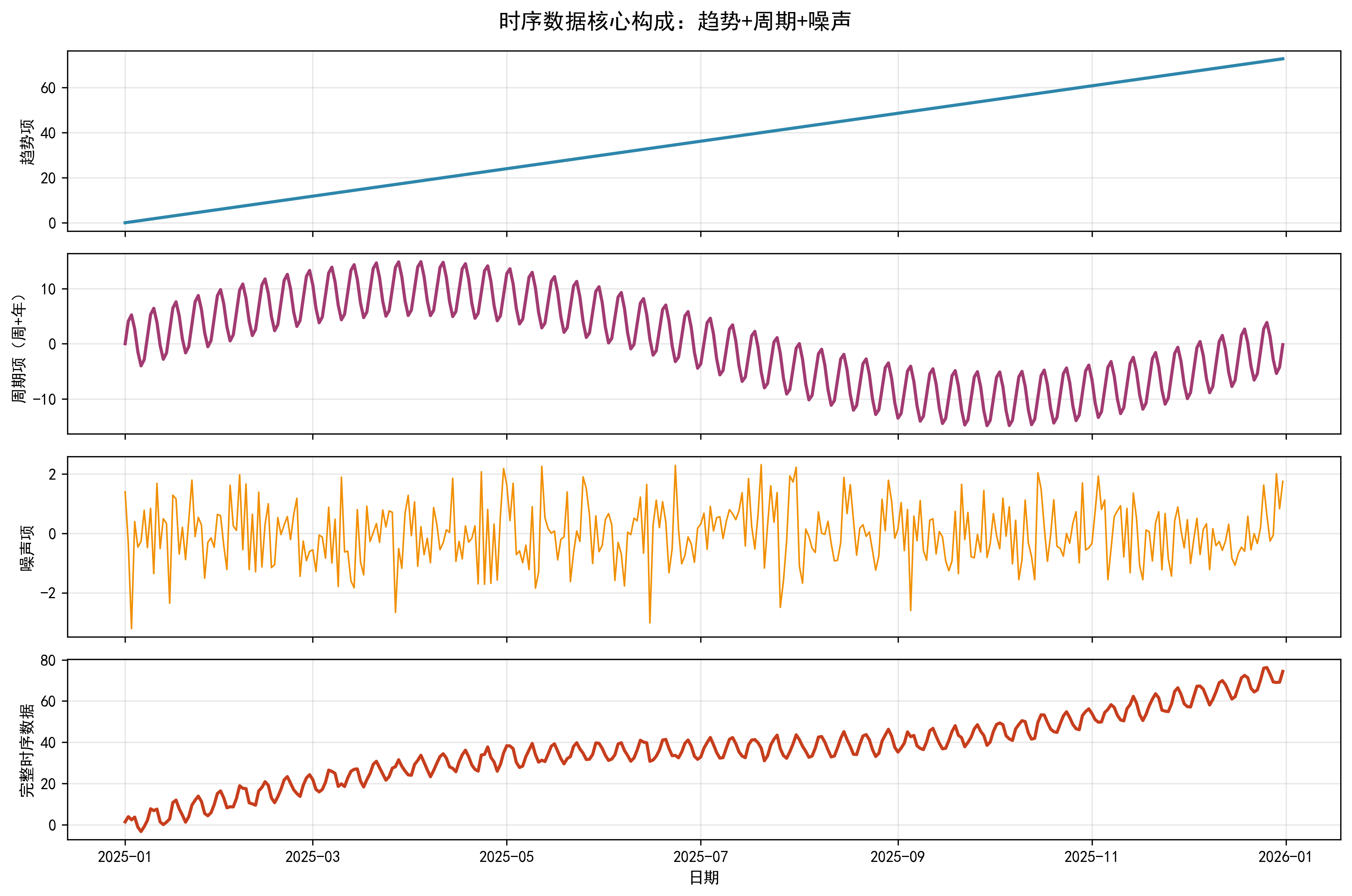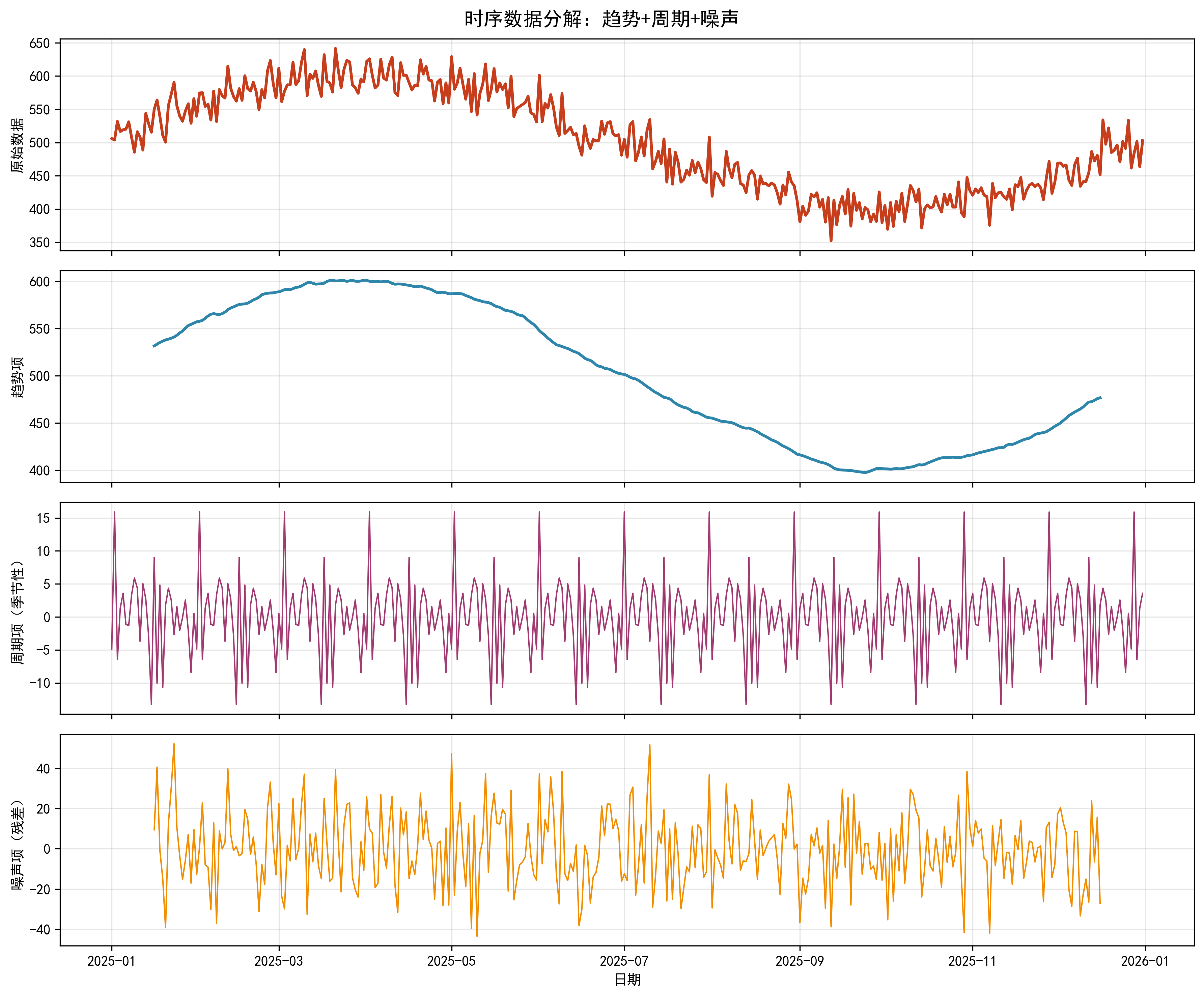noise = np.random.normal(0, 15, len(dates)) # 随机噪声(模拟真实数据波动)