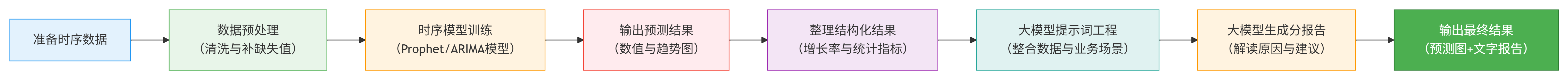 这时候大模型就派上用场了,它相当于一个翻译+参谋,能看懂算法算出的结果,把专业的数字翻译成咱们能听懂的话,还能分析原因、给具体建议。时序预测算法+大模型,本质是一次分工明确的智能组合:传统时序模型负责专业计算,保证预测准;大模型负责理解与表达,保证结果能用。比如算法算出下个月销量会涨,大模型就会告诉我们,可能是因为旺季来了,还会建议我们提前备货。它不需要我们精通复杂数学推导,也不需要我们从零训练大模型,而是把成熟工具串联起来,形成一套 “输入数据→自动预测→自动解读→自动出建议” 的完整闭环。