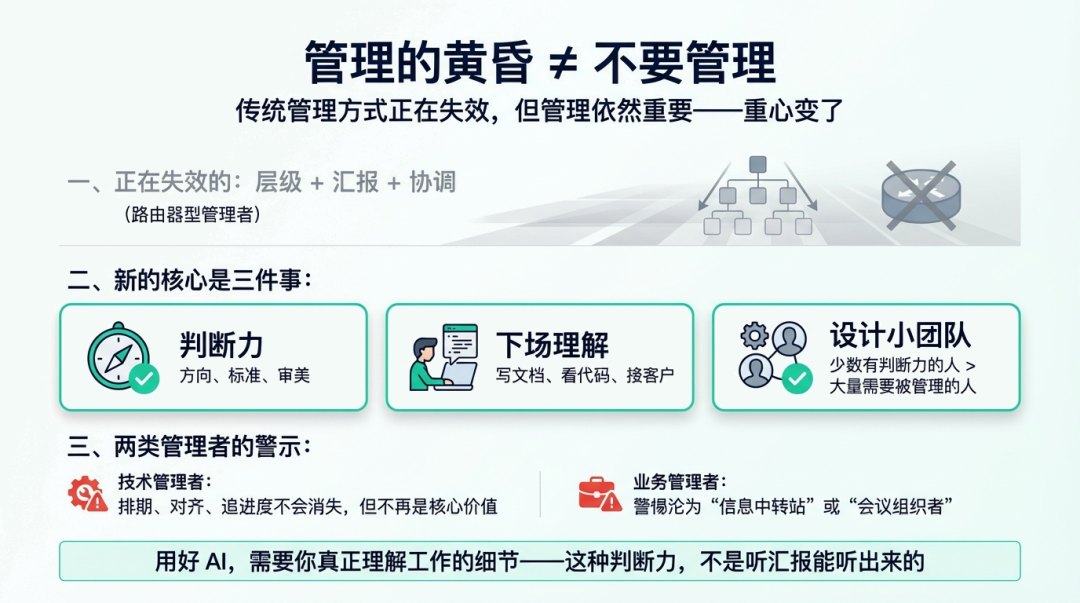 对两类管理者的提醒:技术管理者的"排期、对齐、追进度"不会消失,但不再是核心价值;业务管理者警惕沦为"信息中转站"或"会议组织者"。