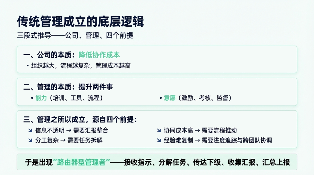 在讲 AI 怎么改变管理之前,先用三段式把"传统管理为什么是这样运作的"讲清楚。