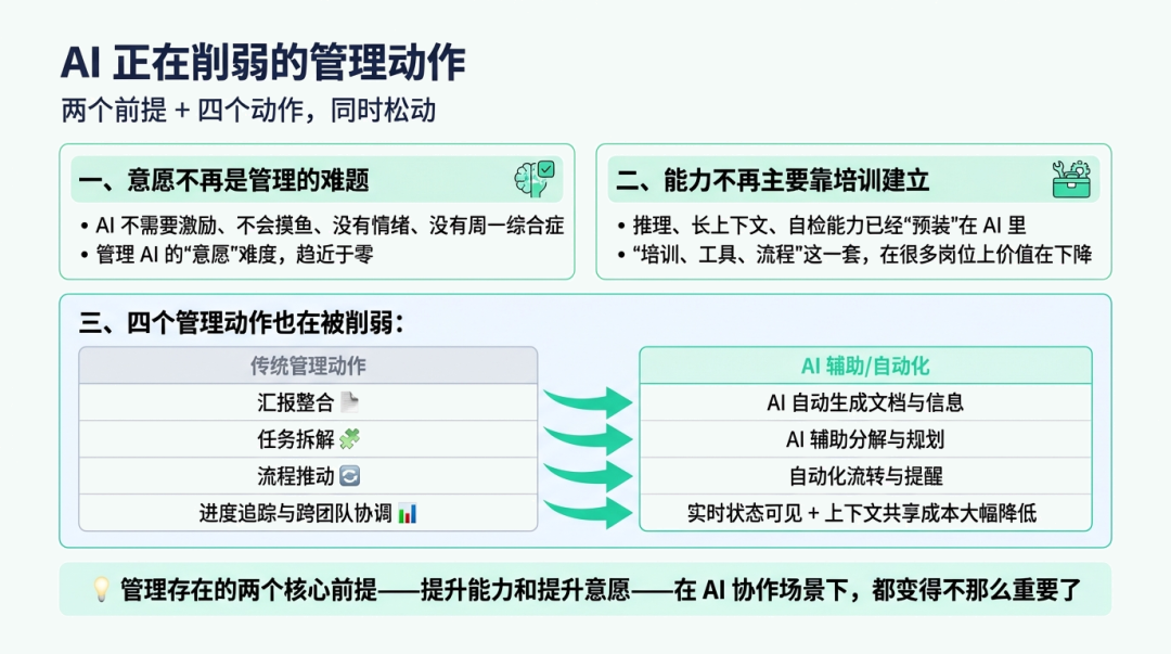 结论是:管理存在的两个核心前提——提升能力和提升意愿——在 AI 协作场景下,都变得不那么重要了。 不是说这些管理动作会消失,而是它们越来越不构成管理者的核心价值。