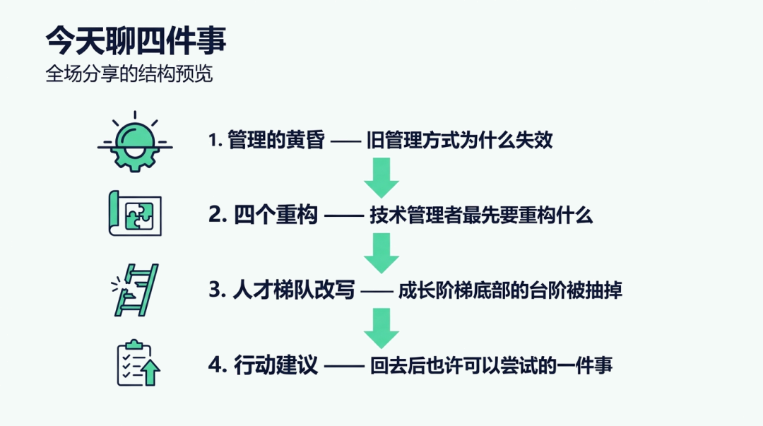 这次分享把我最近两年在 AI 实践中的一些思考,串成了一个比较完整的框架:从"管理的黄昏"出发,经过"四个重构"和"人才梯队改写",最后落到"行动建议"。