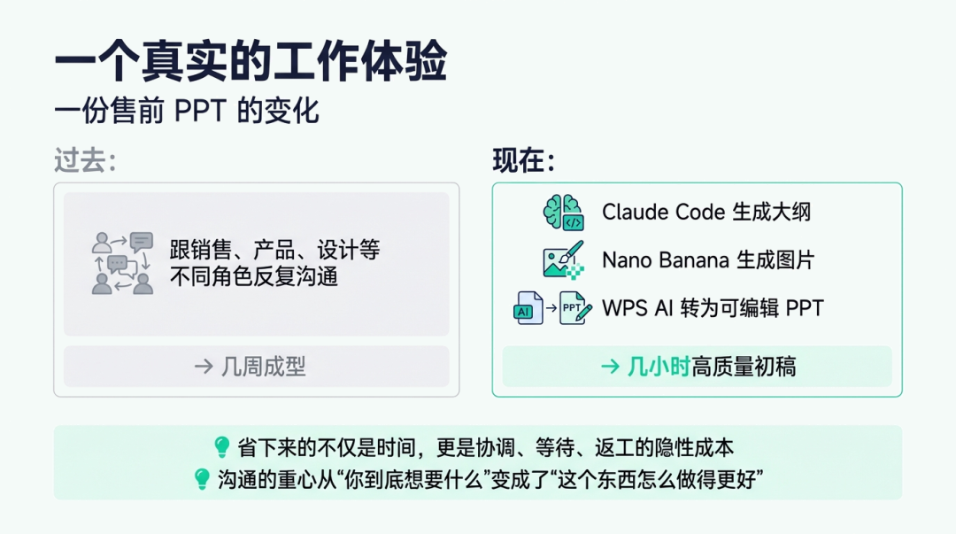 过去做一份售前 PPT,得跟销售、产品、设计不同角色反复沟通,几周才能成型。现在的流程是:先跟 Claude Code 一起生成大纲,用 Nano Banana 根据大纲生成每一页 PPT 的图片,需要修改的那一页用 WPS AI 转成可编辑格式再调整。几个小时,就能做出高质量的初稿。