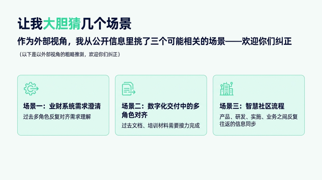 作为外部视角,我对龙湖数科的具体业务了解有限。分享的时候我从公开信息里挑了三个可能相关的场景,大胆猜一下——