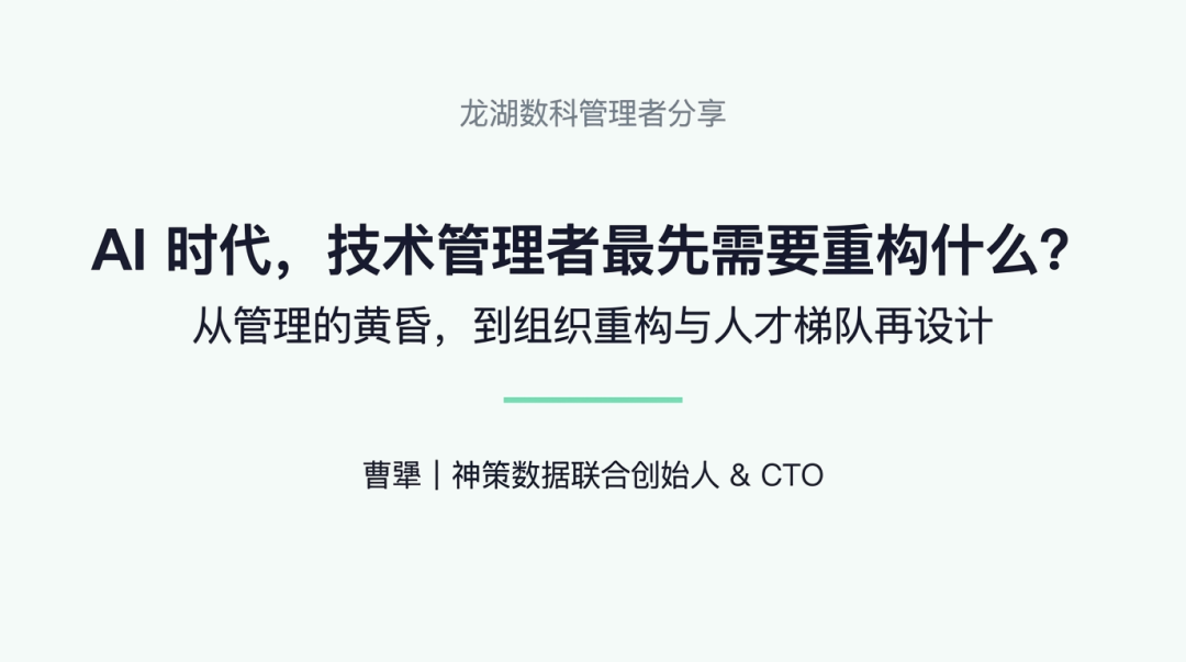 今天受邀到龙湖数科给他们的技术和业务管理者做了一次分享,主题是:AI 时代,技术管理者最先需要重构什么? 整场分享大概 50 分钟加 10 分钟 Q&A。