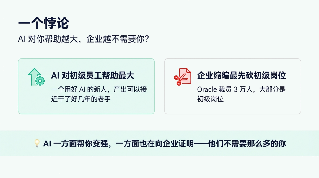 一方面,AI 对初级员工的帮助最大——一个会用 AI 的新人,产出可以接近干了好几年的老手。但另一方面,企业缩编最先砍的却是初级岗位,Oracle 最近裁员 3 万人,大部分是初级岗位。