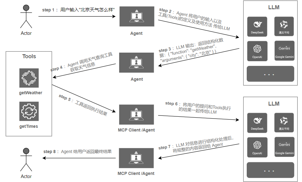 工具调用的核心原理可以概括为 “三轮对话” 模式: