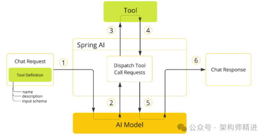 定义工具的入口,标注在 Spring Bean 方法上,Spring AI 自动识别并注册为可调用工具Spring AI 已经把工具调用流程封装得非常简单,整体流程只有 5 步: